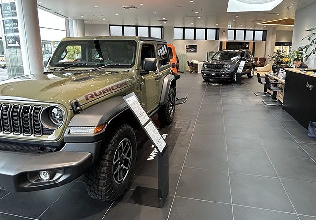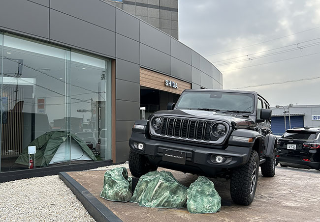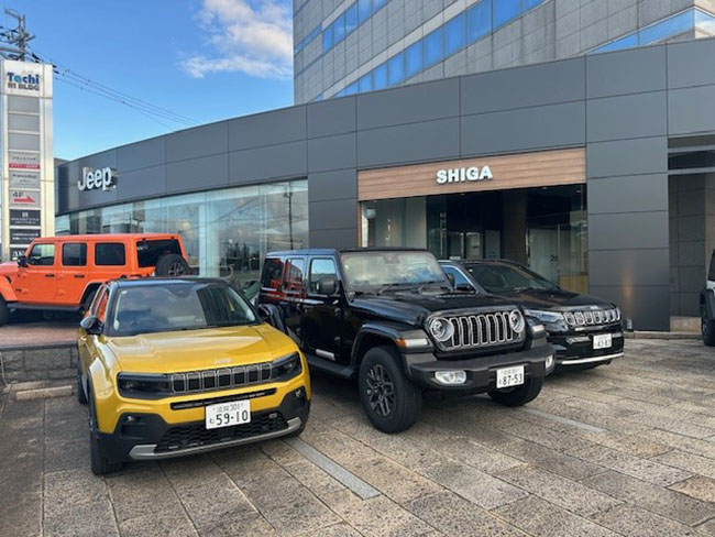 2023年4月22日ジープ正規ディーラーであるジープ滋賀は新しく生まれ変わりました。 新しく生まれ変わった「ジープ滋賀」は、ジープのテーマカラーのブラックとウッドパネル、シルバーのブランドバッチサインが際立つスクエアフォルムの重厚感ある建物となっております。ショールームの屋外にも展示スペースを設け、ジープの躍動感を四季を通して演出いたします。 店内は外観同様にブラックタイルとウッドタイルで構成され、ジープのセブンスロットグリルをモチーフにしたガラスパネルが印象的な専用受付カウンターを設置、壁面はジープのグラフィックを装飾し、「フィーチャービークルディスプレイエリア」では最新モデルなどの特選車の展示をお楽しみいただけます。 また、ジープの最新映像がお楽しみいただける大型ディスプレイを中心にソファセットやカウンター&チェアを配したラウンジエリアを設けました。ご家族皆様でおくつろぎいただけるプレミアムな空間で、ジープの魅力溢れるモデルをゆっくりとご覧ください。 新車だけではなく、認定中古車を展示するオートエキスパートコーナーも充実させ、安全な環境で車両の確認や納車が行えるように配慮されたデリバリーエリア、専用サービスワークショップも完備いたしました。 お客様の安心で安全なカーライフをスタッフ一同しっかりとサポートしてまいります。